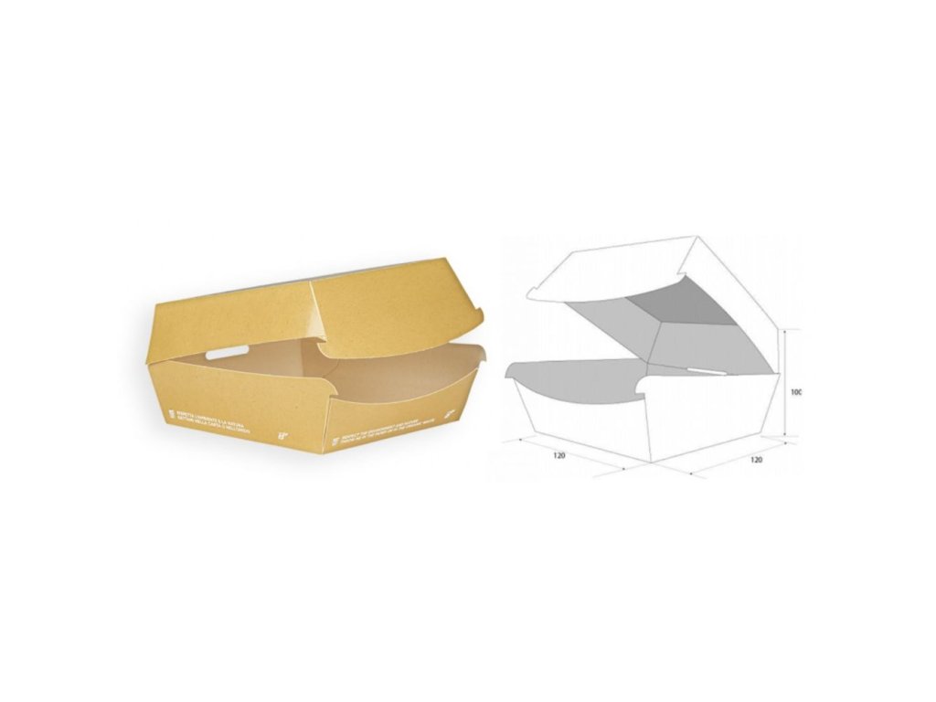 Papierová krabička na hamburger alebo iné chuťovky 120×120×70 mm, balenie 50 ks – ideálna na bezpečný transport a zachovanie čerstvosti. Recyklovateľná a hygienická, chráni pokrm pred vonkajšími vplyvmi.