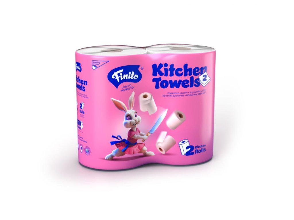 Dvojvrstvové kuchynské utierky Finito – 150 útržkov v kotúčiku, balenie 2 ks. Vysoko savé a pevné na rýchle a hygienické upratovanie v kuchyni aj v domácnosti.