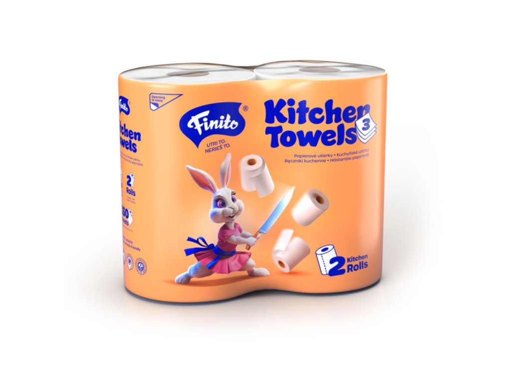 Trojvrstvové kuchynské utierky Finito – 150 útržkov v kotúčiku, balenie 2 ks. Vysoko savé a extra pevné na rýchle a hygienické upratovanie v kuchyni aj v domácnosti.