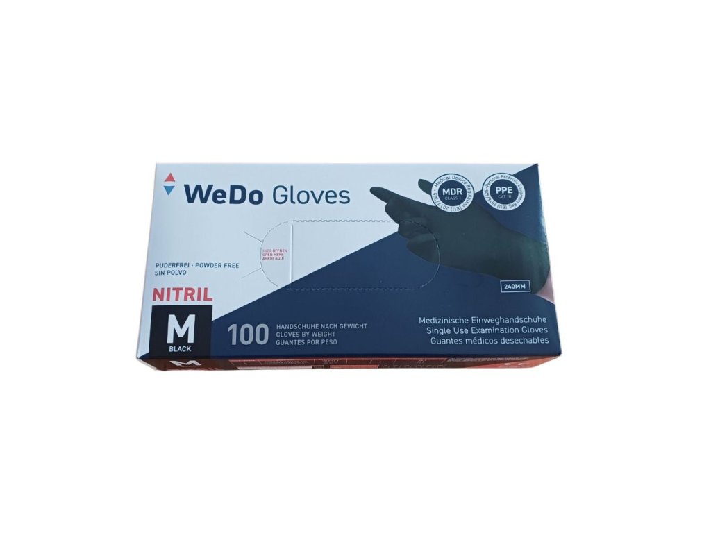 Jednorazové nitrilové rukavice, veľkosť M, čierne – balenie 100 ks. Pevné a elastické, odolné voči prepichnutiu a chemikáliám, bez latexu; ideálne pre gastro, hygienu, kozmetiku aj upratovanie.