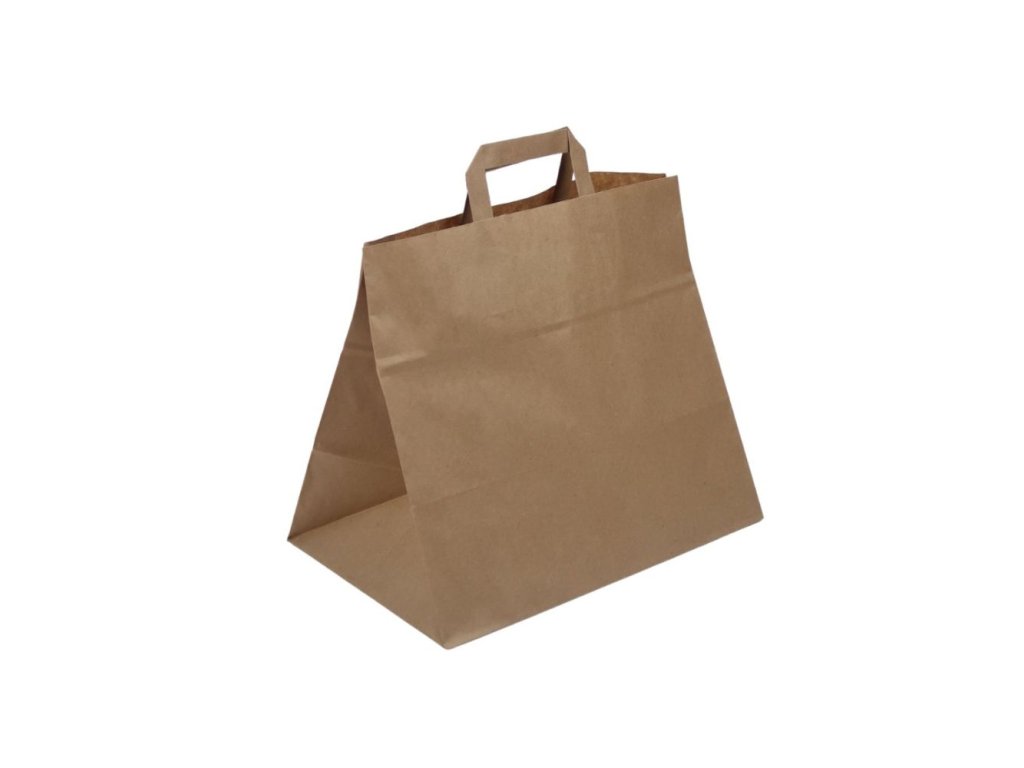 Hnedá papierová taška 32 × 21 × 33 cm s extra širokým dnom a plochým uchom – stabilná a elegantná voľba na balenie menučiek. Balenie 50 ks, vhodná na potraviny, darčeky či nákupy v obchodoch a gastro prevádzkach.