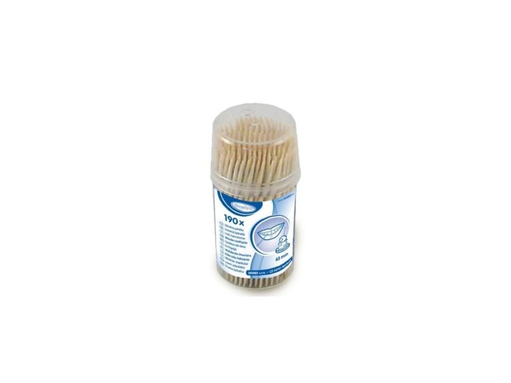 Drevené špáradlá v uzatvárateľnej nádobke (Ø2 × 65 mm), balenie 190 ks. Hygienické a hladko brúsené – praktické na stolovanie v domácnosti aj gastro prevádzkach.